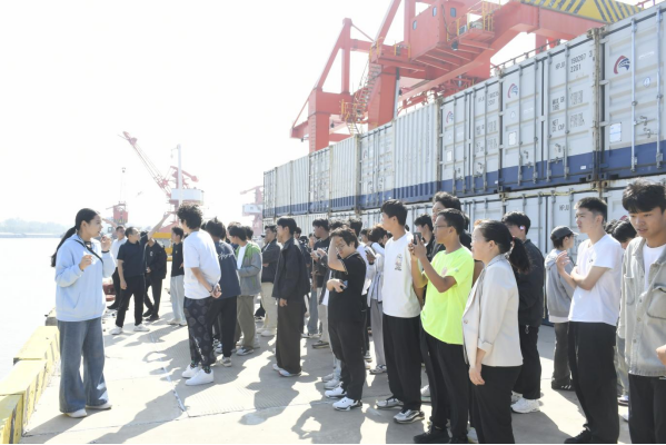 在周口港的现代化作业区,港口工作人员为师生详细介绍了运营情况。在企业方人员引导下,同学们分组有序参观了码头前沿,观察泊位结构、岸桥、门机等装卸设备,了解航道水深、宽度、护岸工程等。此外,还了解了船舶进出港调度、作业计划安排、实时监控系统的运行,观察了货物的装卸、仓储、理货等流程。